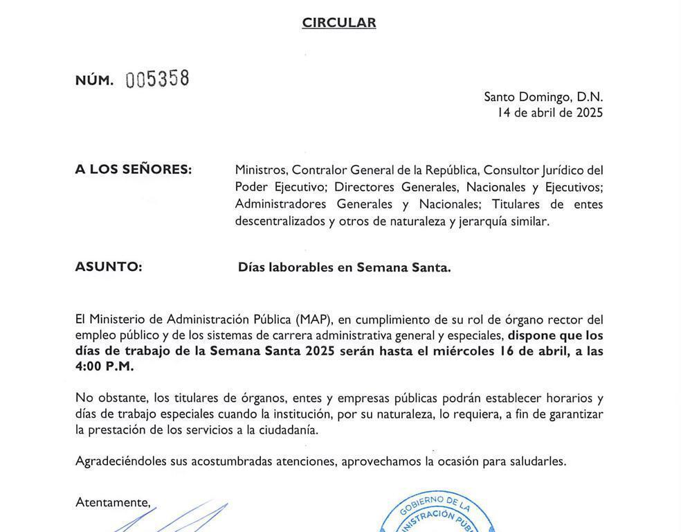 Santo Domingo, RD. – Por motivo del asueto de la Semana Santael Ministerio de Administración Pública (MAP), en cumplimiento de su rol de órgano rector del empleo público, dispuso que las instituciones públicas solo laborarán hasta el miércoles 16 abril a las 4:00.p.m.